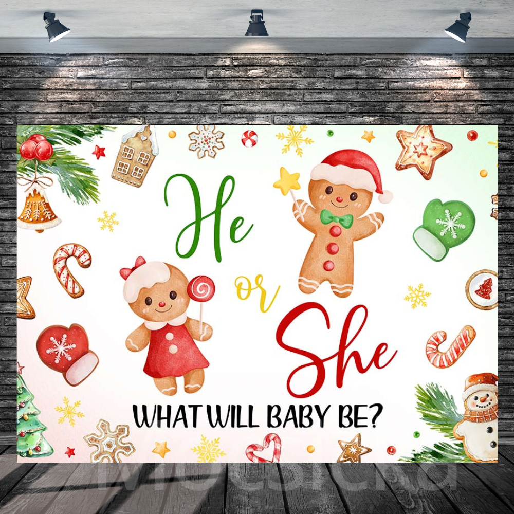 Mocsicka "He or She - What Will Baby Be?" Christmas for Baby Shower Backdrop