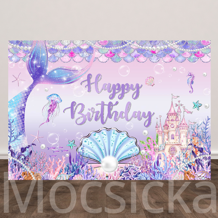Mocsicka Happy Birthday with Mermaid and Underwater Elements Backdrop for Birthday