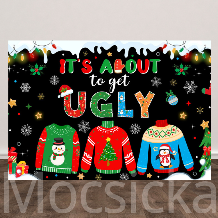 Mocsicka "It's About to Get Ugly" Ugly Christmas Sweater - Themed Backdrop