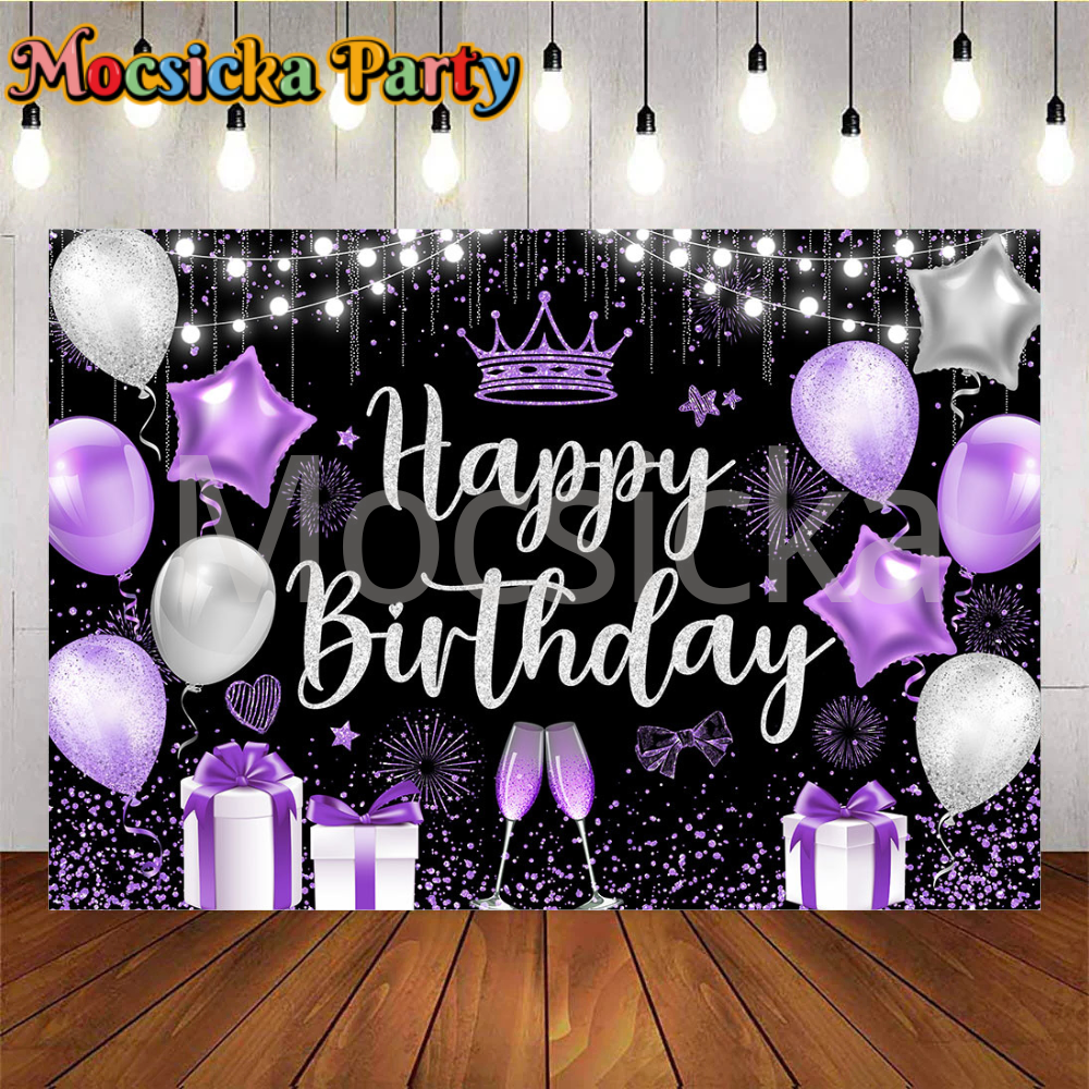 Mocsicka Purple Star Balloons And Crown Happy Birthday Photo Backdrop