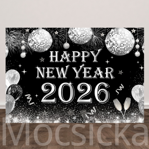 Mocsicka "2026 Happy New Year with Silver Disco Ball" for New Year Party Backdrop