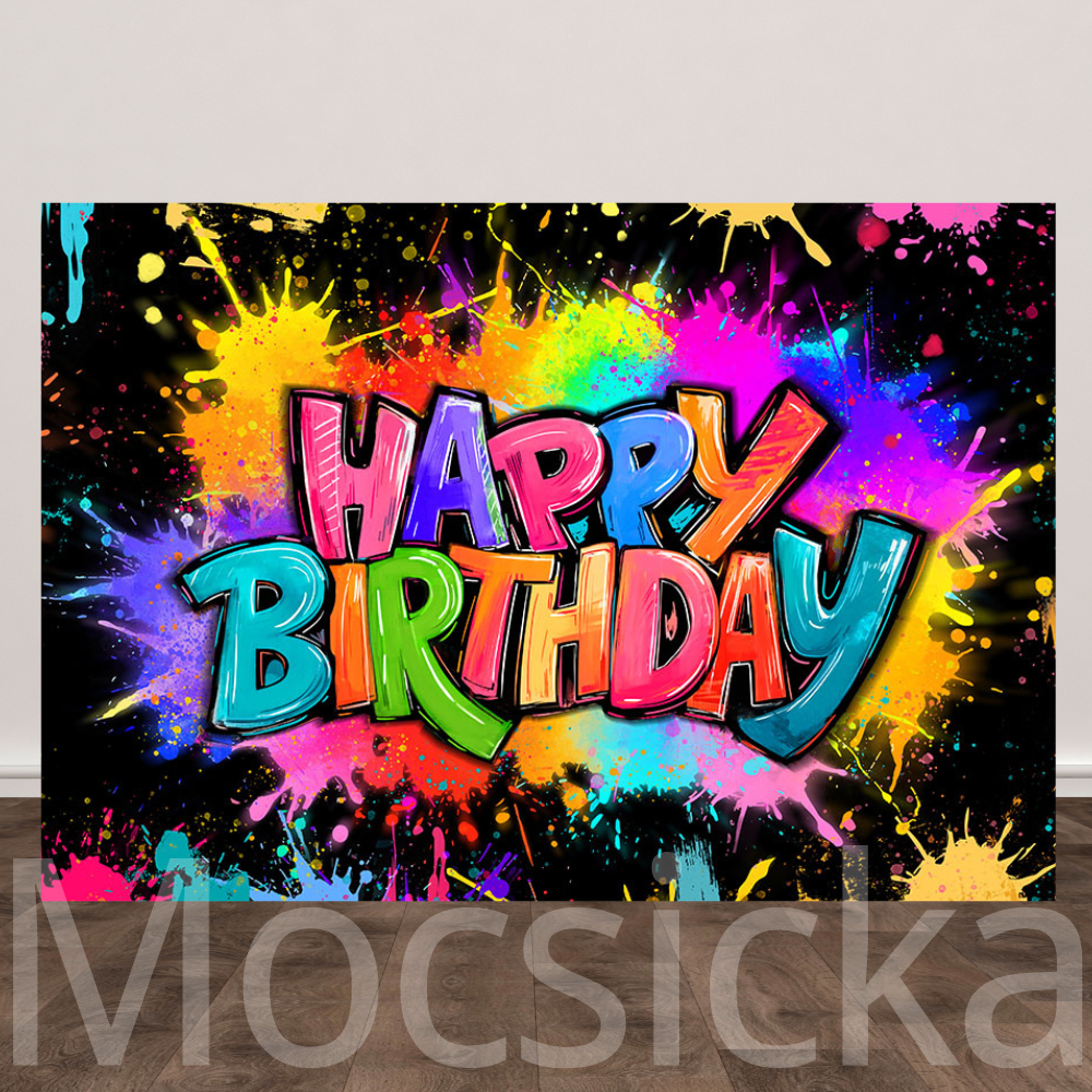 Mocsicka Neon Paint Splatter Happy Birthday Backdrop for Party