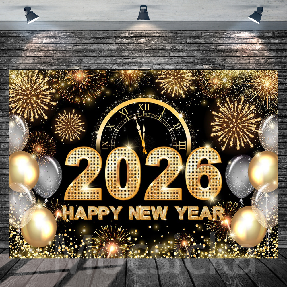 Mocsicka "2026 Happy New Year - Golden Fireworks & Clock" for New Year Party Backdrop