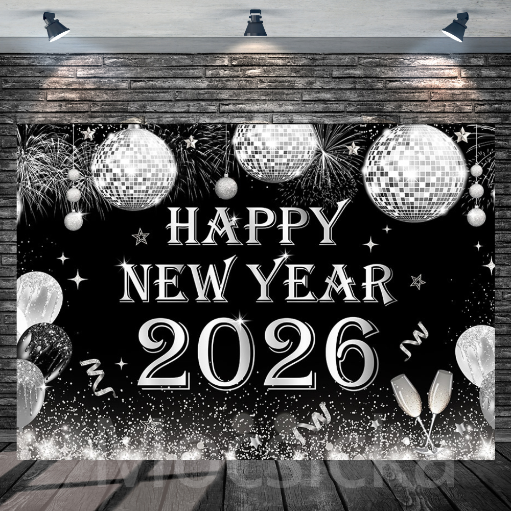 Mocsicka "2026 Happy New Year with Silver Disco Ball" for New Year Party Backdrop